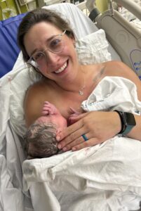 At 1:30pm I felt a sharp change in the contractions – and the urge to push. The nurses quickly got set up and let me pick a more upright position with a nurse and my husband holding my legs to allow me to be more comfortable but also in a delivery position they felt confident with. I pushed when I felt the urge, and was encouraged to listen to my body and do what it needed. At this point my water was still in tact, and just as they called the OB in to break it at 1:45 pm, it exploded all over the nurse (who was a great sport). I transitioned almost immediately and felt baby move down through the birth canal. With some very thoughtful coaching, breathing, short controlled pushes and a lot of incredible encouragement, I had my 8lb 6oz baby at 1:50pm.